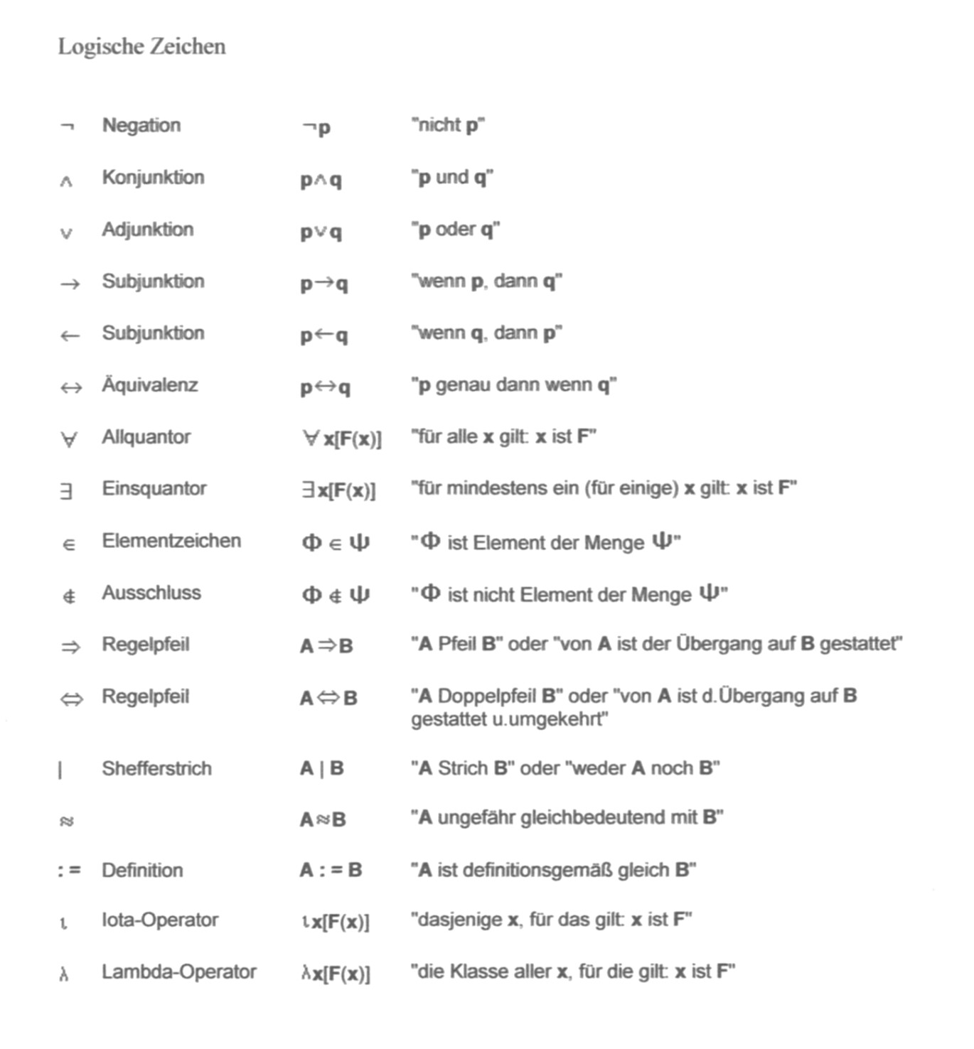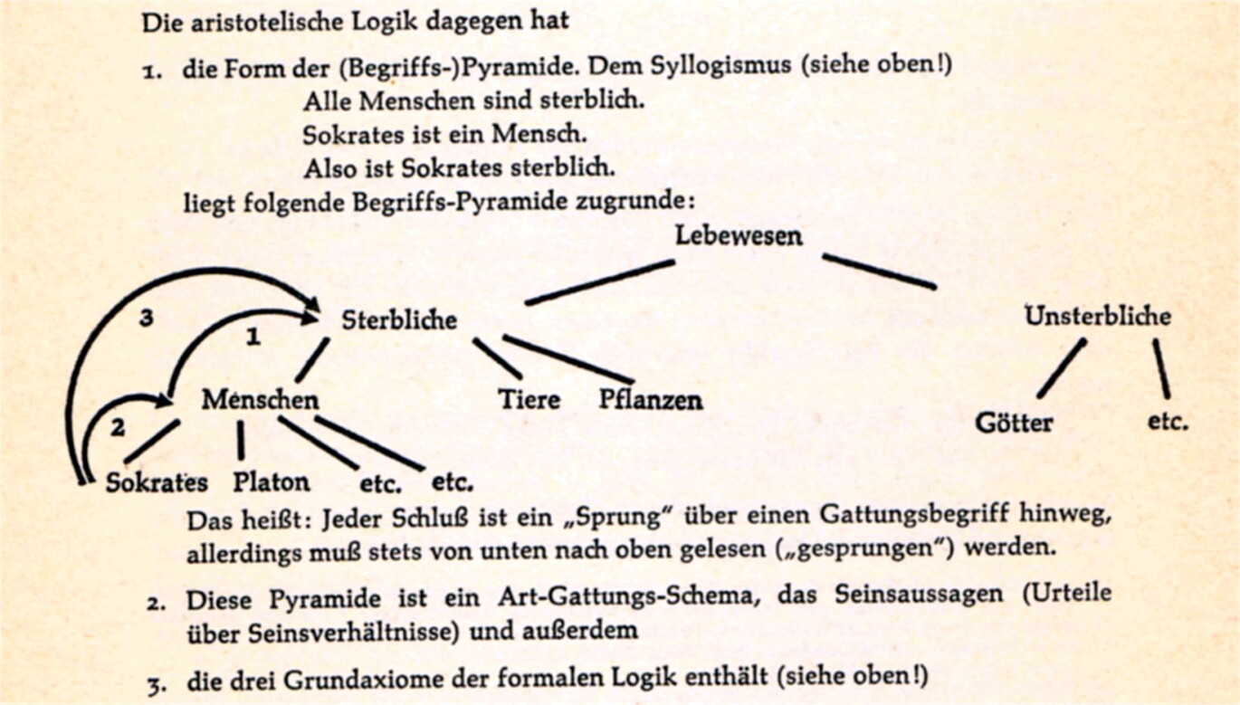 Um zu zeigen, dass die Möglichkeit der Bildung von Scheinsätzen auf einem logischen Mangel der Sprache beruht, stellen wir das unten stehende Schema auf. Die Sätze unter l sind sowohl grammatisch wie logisch einwandfrei, also sinnvoll. Die Sätze unter ll (mit Ausnahme von B 3) stehen grammatisch in vollkommener Analogie zu denen unter 1. Die Satzform Il A (als Frage und Antwort) entspricht zwar nicht den Forderungen, die an eine logisch korrekte Sprache zu stellen sind. Sie ist aber trotzdem sinnvoll, da sie sich in korrekte Sprache übersetzen lässt; das zeigt der Satz lll A, der denselben Sinn wie ll A hat. Die Unzweckmäßigkeit der Satzform ll A zeigt sich dann darin, dass wir von ihr aus durch grammatisch einwandfreie Operationen zu den sinnlosen Satzformen ll B gelangen können, die dem obigen Zitat entnommen sind. Diese Formen lassen sich in der korrekten Sprache der Kolonne lll überhaupt nicht bilden. Trotzdem wird ihre Sinnlosigkeit nicht auf den ersten Blick bemerkt, da man sich leicht durch die Analogie zu den sinnvollen Sätzen l B täuschen lässt. Der hier festgestellte Fehler unserer Sprache liegt also darin, dass sie, im Gegensatz zu einer logisch korrekten Sprache, grammatische Formgleichheit zwischen sinnvollen und sinnlosen Wortreihen zulässt. Jedem Wortsatz ist eine entsprechende Formel in Schreibweise der Logistik beigefügt; diese Formeln lassen die unzweckmäßige Analogie E zwischen l A und ll A und die darauf beruhende Entstehung der sinnlosen Bildungen ll Bbesonders deutlich erkennen.Schreibweise der Logistik4 beigefügt; diese Formeln lassen die unzweckmäßige Analogie E