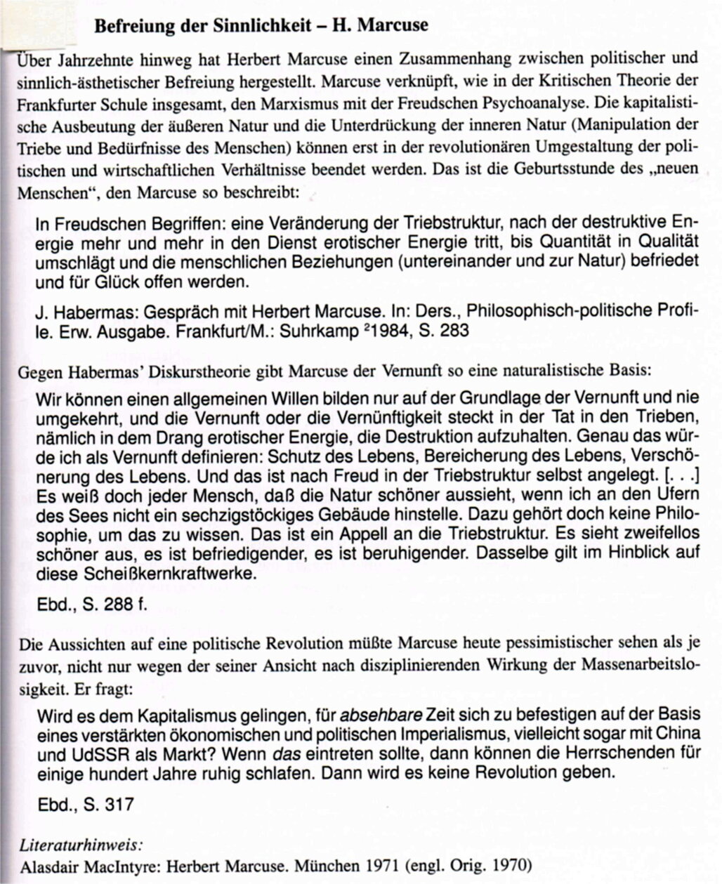 Gottfried Benn, selber einer der profilierten Sprecher der modernen zynischen Struktur, hat wohl die Jahrhundert-formulierung des Zynismus gegeben - luzide und unverschämt: ›› Dumm sein und Arbeit haben, das ist das Glück.<< Die Umkehrung des Satzes zeigt erst seinen vollen Inhalt: Intelligent sein und dennoch seine Arbeit verrichten - das ist unglückliches Bewußtsein in der modernisierten, aufklärungskranken Form. ››Dumm<< und arglos kann es nicht wieder werden, und Unschuld ist nicht wiederherzustellen. Es verharrt im Glauben an die Schwerkraft der Verhältnisse, an die sein Selbsterhaltungstrieb es bindet. Wenn schon, denn schon. Bei zweitausend Mark netto im Monat beginnt leise die Gegenaufklärung; sie setzt darauf, daß jeder, der etwas zu verlieren hat, mit seinem unglücklichen Bewußtsein privat zurechtkommt oder es mit ››Engagements« überbaut. -