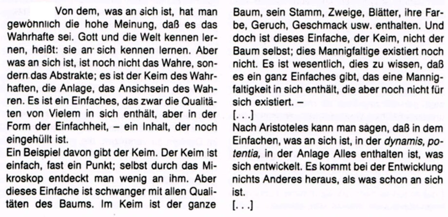 ...] Nicht müßig sind Spekulationen, ob der Antagonismus im Ursprung menschlicher Gesellschaft, ein Stück prolongierter Naturgeschichte, als Prinzip homo homini lupus (der Mensch dem Menschen ein Wolf) ererbt oder erst thesei geworden sei; und ob er, wäre er schon entsprungen, aus den Notwendigkeiten des Überlebens der Gattung folgte und nicht gleichsam kontingent, aus archaischen Willkürakten von Machter- greifung. Damit freilich fiele die Konstruktion des Weltgeistes auseinander. Das geschichtliche Allgemeine, die Logik der Dinge, die in der Notwendigkeit der Gesamttendenz sich zusammenballt, gründete in Zufällígem, ihr Äußerlichem; sie hätte nicht zu sein brauchen.