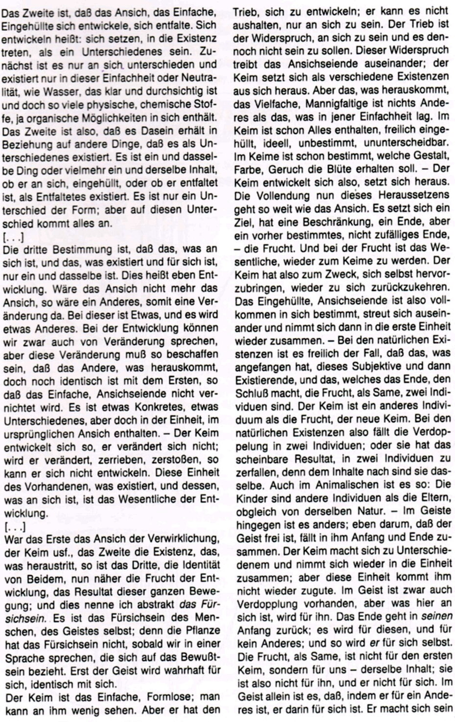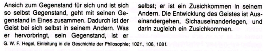 ...] Nicht müßig sind Spekulationen, ob der Antagonismus im Ursprung menschlicher Gesellschaft, ein Stück prolongierter Naturgeschichte, als Prinzip homo homini lupus (der Mensch dem Menschen ein Wolf) ererbt oder erst thesei geworden sei; und ob er, wäre er schon entsprungen, aus den Notwendigkeiten des Überlebens der Gattung folgte und nicht gleichsam kontingent, aus archaischen Willkürakten von Machter- greifung. Damit freilich fiele die Konstruktion des Weltgeistes auseinander. Das geschichtliche Allgemeine, die Logik der Dinge, die in der Notwendigkeit der Gesamttendenz sich zusammenballt, gründete in Zufällígem, ihr Äußerlichem; sie hätte nicht zu sein brauchen.