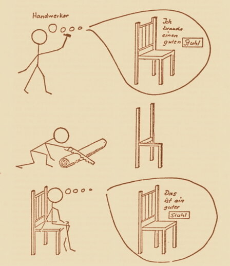 Notwendig also ist auch der Gebrauchende immer der Erfahrenste und muß dem Verfertiger Bericht erstatten, wie sich das, was er gebraucht, gut oder schlecht zeigt im Gebrauch. Wie der Flötenspieler dem Flötenmacher Bescheid sagen muß von den Flöten, welche ihm gute Dienste tun beim Bla-sen, und ihm angeben muß, wie er sie machen soll, dieser aber Folge leisten muß.