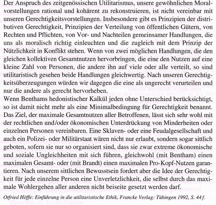 Aus: Bentham, Jeremy: Eine Einführung in die Prinzipien der Moral und der Gesetzgebung. In: Otfried Höffe (Hrsg.): Einführung in die utilitaristische Ethik. A. Francke Verlag, Tübingen/Basel, 3. Auflage 2003, S. 55–58. Mit freundlicher Genehmigung des Dr. Josef Raabe-Verlags. Aus: König, Alexander; Jochum, Peter; Jungblut, Dorothee (2006): Was soll ich t